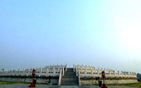 这座由汉白玉砌成的圆丘,是明清两代皇帝祭天祈雨的宝地。可以想象,当年皇上就是站在这圆丘之上,与天对话的。其实,这圆丘坛高仅5.18米,四周的壝墙也只有1.76米,只因设计者采用压低白玉栏杆和壝墙的高度,才衬托出主体建筑的崇高。而且壝墙与祭台之间拉开了距离,从视觉效果上,壝墙就显得更低,墙外的树丛被推远,树丛就不会对祭台形成压力。人在这样一个宽阔的空间里,登上圆丘坛,就会感到居高临下,四周空旷,你就会感到,建筑的外部轮廓和天空直接相连,仿佛置身与琼楼玉宇当中,这时你不免有种“不敢高声语,恐惊天上人”的感觉。