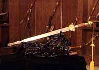在中国古代琳琅满目的冷兵器家族中,剑是一种源远流长,有刺杀护卫和装饰佩带双重功能的兵器。它的形制特点是:直身,尖锋,双刃,后接短柄,蝶形护手,配有剑鞘。古人称之为直兵。春秋末期,吴越两国发明了冶铁术,也就有了欧冶子所铸的名为“龙渊”的第一把铁剑,开创了中国冷兵器之先河。自此两千四百多年来,由于剑在历史上曾经有过的辉煌,形成了它深厚的文化现象。中国古代丰富多彩的用剑方式,历史名人与剑的故事,文人墨客咏剑的佳作,以及瑰丽动人有关剑的传说,无不蕴涵着丰富的文化内容。文学作品与影视作品更是常有剑的身影出现。今天的宝剑传人们,把这古老的技艺提升到了一个新的高度,赋予了剑更多的文化内涵。