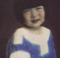 差不多70年后,张爱玲面对童年时拍下的一张照片,写道:面团团的,我自己都不认识了。但是,不是我又是谁呢?把亲戚间的小女都想遍了,全都不像,倒是这张藤几很眼熟,还有这件衣服——不过我记得的那件衣服是淡兰色薄绸,印着一蓬蓬白雾。T字形白绸领,穿着有点傻头傻脑的,我并不怎么喜欢,只感到亲切。随又记起,那天我非常高兴,看见我母亲替这张照片着色。一张小书桌边亮搁在装着玻璃窗的狭窄的小阳台上,北国的阴天下午,仍旧相当幽暗。我站在旁边看着,杂乱的桌面上有黑铁水彩画颜料盒,细瘦的黑铁管毛笔,一杯水。她把我的嘴唇画成薄的红唇,衣服也改填最鲜艳的蓝绿色。”