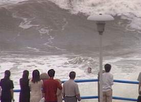 那天的海浪足有七、八米高,一个大浪打过来,岸边避闪不及的三个女孩被击倒,其中两个抓住了栏杆,而一个女孩却被海浪无情地卷了下去。