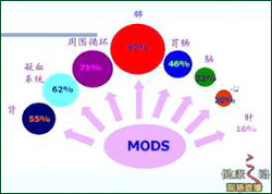 主持人:如果发生了多脏器功能衰竭,哪些脏器比较容易衰竭?衰竭以后又会有一些什么样的表现呢? 张淑文:如图:在多脏器功能衰竭发生时,肺脏是最容易受到损伤发生衰竭的,可能性达到了92%,其次分别是周围循环系统-71%,凝血系统-62%,肾-55%,胃肠-46%,脑-22%,心-20%,肝-16%。