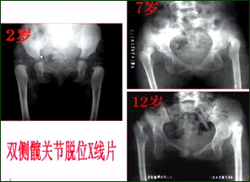 主持人:为什么超过两岁的髋关节脱位患者手术效果就不好了呢? 张志刚:大龄儿童的先天性髋关节脱位是随着小孩的体重增加、年龄增大、活动量增加骨骼和软组织的畸形不断加重,来看三张X光片,第一张X光片是一个2岁小孩的髋关节脱位情况,股骨头与髋臼轻微地脱离,家长没有对小孩进行治疗,第二张X光片是小孩7岁时再次就诊时拍的,可以清楚地看到双侧的股骨头已经向上脱位得很高了,症状明显比2岁时加重了,第三张X光片是患者12岁时拍摄的,这时患者不仅跛形重而且两髋都感觉疼,从片中还可以看到股骨头已经发生了明显的变形,这些畸形也预示患者的治疗更加复杂和困难。再来通过一张示意图看看脱位后软组织的变化,正常的髋臼内是空的,随着脱位时间的延长,关节内的软组织如脂肪、纤维组织等将空隙填满,髋臼随着脱位的升高被逐渐地拉长的同时被拉细,髋臼周围的肌肉、肌腱也随之发生挛缩,看上去呈葫芦状,这些都是影响复位和康复的软组织因素。