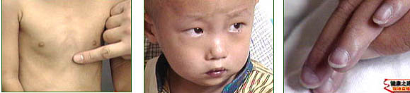 主持人:先天性心脏病有哪些症状? 李守军:先天性心脏病的症状表现在两个方面1、心衰和心功能不全的表现。如刚出生时呼吸急促、吃奶比较费力、喂养比较困难、容易得肺炎,随着年龄的增加症状会随着加重,继续发展可能会出现胸廓隆起、心尖跳动很强等症状,用手放在心脏部位会有异常的震动感。2、缺氧和紫绀的表现。如嘴唇和口腔黏膜青紫、手指尖发暗或发青,紫绀如果逐渐加重,孩子就比较容易死亡。来看一段片子,小孩的脸色比正常人偏暗,还有一些发紫,吃奶或活动后加重并伴有手指肿大等。 郭岩:小孩有时哭闹后也会有口唇或周边部位发暗、发紫的情况,这种情况与紫绀的区别在于,有紫绀的孩子稍微一哭就会有发紫的现象,更严重的在静止状态下也会有发紫的现象,吃奶时吃了几口后就有喘不了气的感觉。