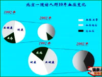 主持人:亚健康状态是一种什么样的情况? 赵冬:对于大多数疾病(特别是心血管疾病)来说,发病以前都有一个或长或短的发展过程,这种介于健康与疾病之间的状态我们通常称之为亚健康状态。 米树华:临床上有些病人几年前有血糖偏高、血脂偏高、血压偏高等情况没有引起重视,几年后就出现了高血压、糖尿病、高脂血症甚至心肌梗塞等情况。正常人的血压状态应该是高压在120毫米汞柱以下,低压应该在80毫米汞柱以下,如果高压达到140毫米汞柱,低压达到90毫米汞柱就称其为高血压患者。介于两者之间的状态我们就称之为亚健康状态。正常人的空腹血糖应该在110毫克(6.1毫摩尔)以下,当空腹血糖达到了126毫克就称其为糖尿病患者。介于两者之间的状态我们就称之为亚健康状态。 赵冬:处于亚健康状态的人可能自己感觉胸闷、气短、失眠、健忘、浑身无力等,到医院进行检查后并没有查出有什么疾病,这种人可能是由于长期处于一种紧张的高强度工作压力下,使得身体各器官的功能受到了一定的损害,但是还没有达到某些生化指标(血液检查、心电图检查)的异常指数。还有一部分人对自己的身体健康状况过于关心,总觉得自己有病。引发亚健康状态的原因大致分为三个方面1、社会原因,如就业、下岗等。2、自然环境,如空气污染等。3、生活方式。亚健康会对身体产生一种持续性的不良影响,血脂偏高、血压偏高、高血脂、超重等都属于亚健康状态,其中衡量是否超重通常以体重指标为标准,体重指标就是体重除以身高的平方。 米树华:有资料统计,处于亚健康状态的人大约占到总人数的30%-75%之间,完全健康或患有某种疾病的人口比例不是很多。 赵冬:如图,图中是北京一随访人群10年血压变化,图中数据表明亚健康状态的人走向疾病的速度和比例比健康的人要高得多。