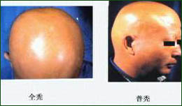 主持人:经常掉头发以及谢顶的现象与斑秃是一回事吗? 邓丙戌:经常掉头发以及谢顶的现象与斑秃是有区别的,来看一张照片斑秃患者脱发区内头发是完全没有的,在非脱发区是完全正常的,脱发区的头皮外观是完全正常的,如果在斑秃的边缘轻轻地拽头发可以很轻松地拽下一块就说明斑秃仍处于进行期。右侧的斑秃患者病情比较严重,更严重的情况还可能发生全秃和普秃,最严重的就是普秃,不仅头发没有了甚至连眉毛、胡须、汗毛都没有了。 陈可平:引起斑秃的原因很多,从西医方面来说不是很明确,中医认为与精神紧张、恐惧、劳累等精神因素有关,另外遗传、过敏、自身免疫疾病也可以引起斑秃,总地来说精神因素引起斑秃占的比例比较大。 邓丙戌:中医认为:1、发为血之余--头发的营养来源于血。2、肾、其华在发--头发的生机根源于肾气。