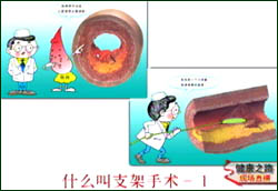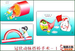 主持人:到医院后医生通常是如何进行处理的? 卢长林:当医院后首先要做心电图,根据病情可以选择的治疗方法有静脉溶栓、冠状动脉的介入治疗、胸外科搭桥手术,目的是为了尽快地开通梗塞的相关血管,达到挽救濒死心肌、保护心功能、减少致残致死率的目的。通过股动脉的穿刺打入造影剂来观察血管的病变情况,根据病变的情况来决定下一步的治疗(支架治疗),如果病变比较广泛可以根据病人的情况选择进行胸外科的搭桥手术,这也是保护梗死心肌、减少致残和致死率的很有效的方法。如图通过搭桥使血流绕过病变部位,帮助缺血梗死心肌的供血。