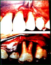 主持人:是不是只有成年人才容易得牙周炎? 沙月琴:这种观点是错误的。3岁的儿童就可以得牙龈炎,5岁的儿童就可以得牙周炎,临床上我们也确实看到过3岁半的孩子得了很重度的牙周炎,所以从幼儿开始就应该关注孩子的牙周健康。 章锦才:青少年牙周炎的发病率明显比中老年人要低得多,但是一旦发病就会十分严重。如图:从外观上看牙龈并没有十分红肿的症状,手术过程中翻开牙龈可以看到牙槽骨已经破坏得非常严重了,患者是因为觉得牙齿开始松动了,才来到医院看病的,到医院后医生通过牙周探测器探察后发现牙周带已经很深了,然后用照X片就看到了牙槽骨的异常情况。