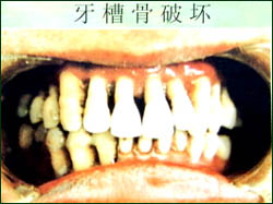 章锦才:来看一张图,病人的牙槽骨破坏得非常厉害,到了这种程度,牙齿就非常松了,这种牙齿只能拔掉,没有什么保留价值了。因为牙周病拔牙已经成为临床中老年人拔牙的最主要的原因。