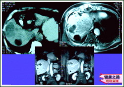 主持人:来看另外一位患者的情况:这位患者是突然肝癌破裂后到医院进行抢救,接受了微波治疗。患者:"去年6月14日我在家里拿花盆时觉得筋拽着脖颈,一直到肩膀,筋拽着疼,送到密云县医院后观察了四、五个小时,由于肝癌破裂大出血,流了6000多毫升血,经过输血抢救后在医院住了15天,以后做了微波治疗后感觉精神好多了,比较重的体力活儿完全可以干,胃口也很好。" 何文:我们来看看对这位患者进行微波治疗的情况:如图肝脏的右叶有一个五乘六厘米的肝癌,治疗后肿瘤明显缩小,肿瘤区完全坏死,患者治疗后的各项指标都恢复了正常,说明对于这一类患者微波凝固治疗也是有效的。 董宝玮:微波局部热疗的优点是在造成肿块本身局部坏死的同时可以激活机体的抗肿瘤免疫功能,因此治疗效果是不错的。