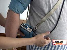 朱鼎良:血压测定的结果受到很多因素的影响,包括环境因素、心理因素等,实际上我们的血压每时每刻都在波动着,如果用24小时动态血压测定来进行血压检测,不仅可以全面和准确地测出血压值,还可以很好的指导用药。来看一段片子了解一下这种测定的具体情况,除了捆上袖带以外,还要运用一种电脑记录盒进行血压数值的记录。