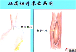 主持人:贲门失弛缓症都有哪些治疗方法呢? 王伟:贲门失弛缓症由于病因还不清楚目前还是针对症状进行治疗,包括三大类治疗1、内科保守治疗,包括饮食疗法和药物治疗,要少吃生、冷、硬的东西,要多吃细软的食物,药物主要是用用一些亚硝酸盐类的药物和钙离子阻滞剂如消心痛等。2、贲门扩张治疗,如图这是整个扩张治疗的示意图,通过胃镜把一个金属扩张器或水囊、气囊,通过胃镜放到贲门口,运用外力把贲门口撑开。以上两种治疗方法都无法彻底治疗,要彻底治疗必须运用第三种治疗方法。3、外科手术治疗。 李辉:外科治疗是针对前两种治疗效果不好而且比较特殊的病例来进行的。1933年有一个叫黑勒尔的人设计了一种贲门食管基层切开术,这种切开术揭开了外科治疗贲门失弛缓症的一个新的篇章,取得了非常好的效果,设计非常合理,操作也很简单,一直沿用到现在。来看一张图,手术首先把食管痉挛的肌肉切开,左图显是的是一个食管狭窄的部位,也就是连接贲门部位,这里有明显狭窄,因此食物到了这里都会产生明显梗阻的情况,手术就是把这一部位的肌层完全切开,我们知道食道是一个隧道我们并非做一个破坏性的手术,而是把大门打开,也就是把肌层切开但是食管粘膜并没有受到破坏,这样打开一个通路后食物就能非常顺畅地进入胃内,完成一个正常的吞咽动作。所以说这种方法操作简单而且效果肯定。
