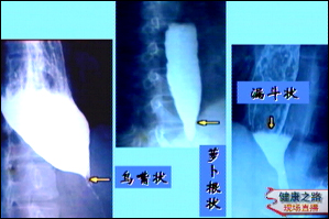 主持人:有哪些检查呢? 王伟:通常对于吞咽困难的患者都会做以下几种检查包括照X光片、食管钡餐造影、食管测压检查等,根据病人的不同情况采取不同的检查。来看一张图,贲门失弛缓症患者通常表现为上纵隔增宽,还会出现双重心影,这是因为食管扩张以后产生了一个比较宽大的食管,在胸片上就表现为纵隔增宽和双重心影。食管钡餐检查是一个最常用的检查,这个检查是诊断贲门失弛缓症的一个关键的检查,它的准确性和敏感性都比较高,食管吞钡检查是将一杯比较稀的造影剂吞入食管,通过照相可以显示出食管的形状以及运动的情况,贲门失弛缓症在钡餐检查的过程中可能会出现一些典型的表现,如图第一张图显示食管近端高度扩张,下端狭窄,这个狭窄段一般有3-5公分长,但是管壁比较柔软而且规则,这是与食管癌不一样的,我们称之为鸟嘴状改变。中间这张图的图形比较像萝卜根须的形状,因此称为萝卜根状。最后一张图也是由于食道根部的狭窄,吞咽的钡剂完全不能下咽,淤积的钡剂像一个漏斗一样,因此称为漏斗状。有了这些典型的表现,通常在临床上就可以诊断为贲门失弛缓症。