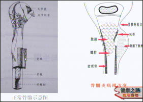 主持人:什么是骨髓炎? 冯峰:骨髓炎不仅是指骨髓发炎,还包括骨膜、骨质以及外面的骨皮质的发炎,是整个骨组织的炎性病变,如图左边是一副正常的骨骼模式图,包在骨头外面的一层较厚的膜叫做骨膜,骨膜下的一层骨板叫做骨皮质,骨髓腔位于骨髓的中央,里面衬有骨内膜,腔内充满了骨髓,发生骨髓炎的时候骨髓、骨质、骨膜都可以引起细菌的感染而导致破坏。右图是一幅骨髓炎的病理改变示意图,可以看到骨髓炎发生时髓腔可以有炎性改变,里面会有脓液形成,骨质也可以受到破坏形成死骨,骨膜下可以形成脓肿,如果这个脓肿穿过软组织和皮肤,可以形成一个创口,长期反复不愈合,因此骨髓炎患者的骨质、骨膜、和外面的软组织都可以发生不同程度的炎性病变。