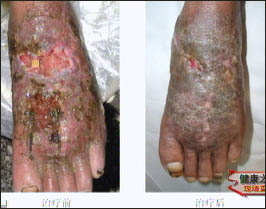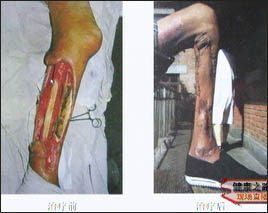 主持人:为什么慢性骨髓炎的治疗很困难? 冯峰:从古到今历代医家都把慢性骨髓炎列为一种疑难性疾病,之所以治疗起来比较困难是因为慢性骨髓炎的疗程长,全身有消耗性的表现,细菌容易在病灶内残留,即使用药也很难达到病灶内,加之病人局部的一些病理改变,病情可以反复发作,不宜根治。治疗应该掌握一个原则,首先要解决它的根本问题,要彻底清除病灶、刮除脓液和炎性组织、消灭死腔,让细菌不能继续残留,改善局部的血液循环。在消除病灶时还要遵循两个原则,一个是要彻底清除病灶,另外还要保证病灶有一个通畅的引流,还应该考虑如何提高局部的抗生素浓度,在治疗上要达到三个目的1、如何缩短疗程。2、如何降低复发率。3、尽量保存肢体功能。 慢性骨髓炎常见的三种类型 1、 骨折已愈合,遗留有窦道和创面 2、 慢性骨髓炎伴有皮肤、骨骼缺损 3、 慢性骨髓炎伤口已愈合,骨折不愈合 王新卫:如图第一种类型的治疗通常是用中药进行治疗,把中药放入窦道里,去除腐烂的组织,经过一段时间的治疗,窦道已经完全消失了。第二种类型的治疗也是用中药进行冲洗治疗,中药冲洗的作用主要有活血化瘀、改善局部血液循环、解毒杀菌、清洁创面,最终达到创面愈合。来看一个片子这是在给一位脚部的慢性骨髓炎病人进行中药冲洗治疗,冲洗机可以调节冲洗的深度、部位、温度、压力等,然后进行循环冲洗。如图冲洗治疗后效果是非常好的。一般来说创面在10平方厘米以下需要冲洗1个月左右,每天冲洗两次,每次冲洗30分钟。如图像这种病人应该早期进行骨皮瓣的移植,对于这类病人要掌握一个原则,病人的创面要新鲜,如果创面的分泌物比较多、有脓液、有腐烂的组织,在中药冲洗下净化创面、改善局部的血供然后再做创面的关闭。如图这是术后两年的回访情况,病人的关节功能恢复得非常好。第三种类型在临床上是比较多见的,如图中间的是一张胫骨上端的慢性骨髓炎,把好腿上的小骨头移植到缺损处,移植后可以看到骨折已经愈合,但是骨头比较细,病人还不能完全负重,经过一年的随访小骨头现在已经增粗了很多,几乎与原来的胫骨一样粗,这种情况就可以完全负重了。骨头增粗对于儿童比较明显,大约两年时间就可以了,对于成人增粗大约需要4-5年。
