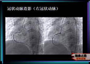 主持人:为什么还要进行有创的检查? 张兆琪:有创检查主要就是指的冠状动脉造影,冠状动脉造影检查是一个对冠心病检查的金标准。具体操作一般是采用在下肢股动脉进行穿刺,穿刺后经过穿刺针放进一个导管,这个导管一直放到主动脉的冠状动脉开口处,然后把导管送入冠状动脉开口,通过导管打造影剂,如图这是一个冠状动脉造影在实施过程中的一个动态图象,放入支架后就把狭窄的部分解决了。冠状动脉造影除了有诊断作用以外同时还有治疗作用。这种检查方法对病人来说存在一定的危险,但是经过多年的技术磨练,目前这种技术在医院里医生的操作是有把握的,尽管有一定的并发症和死亡率(0.14%)但毕竟是很少的。