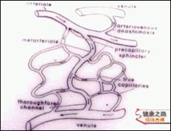 主持人:什么是微循环? 袁申元:微循环在人体的循环系统中是一个非常重要的部分。人体循环系统的中心就是心脏,心脏可以起到一个泵的作用,血液离开心脏后经过大动脉、中动脉、小动脉然后流到全身,当血液流到最细的小动脉时我们称之为细动脉,细动脉眼睛是看不见的,然后细动脉最后又要经过最细的静脉,通过大静脉再回到心脏,这就是我们所说的大循环。在大动脉和静脉之间必需要有一个联系的纽带,这就是微血管,来看一张微血管的模式图,血液从最细的动脉中流进来,然后分成许多的小血管,这些小血管呈网状分布到细胞的各个方面,这许多的网状结构就是毛细血管,毛细血管的血液往外流,经过最细的静脉就流出去了。其中细动脉、细静脉和毛细血管的网我们称之为一个微循环的单位,研究微循环单位里流动的血液的科学叫做微循环。