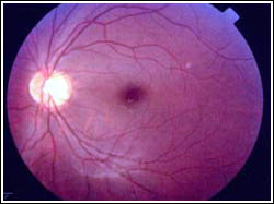 主持人:来谈谈糖尿病的眼底改变。 王光璐:眼睛的微循环特别丰富,通过眼睛可以看到微循环的情况,这一点是其它器官不具备的。 袁申元:来看一张图,糖尿病引起微循环障碍典型的病变就是视网膜病变,也可以引起肾脏病变等其它病变。 王光璐:这是一个眼底示意图,可以看到血管是很丰富的。通过眼底造影可以清楚地看到,最小、最细的线就是微血管。另一张图可以看到糖尿病患者的眼底与正常眼底就大不相同了,细小的血管都完全不起作用了,最直接的结果就是双目失明。