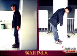 主持人:广西孔女士 56岁 我儿子30岁,患强直性脊柱炎12年,病情时轻时重,最近几个月病情反复,不能上班,腰背疼痛,夜里不能自己翻身,血沉特别快,他病成这样,还能治吗? 阎小萍:病人的情况比较严重,通过中西医结合的方法进行治疗是可以取得一定的进展的。我们以前曾经治疗过类似的病人,治疗后症状和体征都有了明显改善,化验指标也逐渐恢复了正常,功能活动也逐渐恢复。如图左图是刚住院时的情况,患者尽了最大努力,手仍然不能接触地面,经过中西医药物的综合治疗,右图是患者出院后再回来复查时的情况,双手指已经可以和正常人一样触摸到地面了。