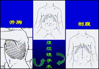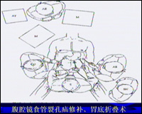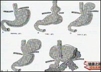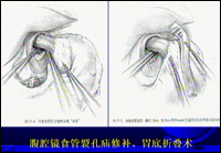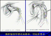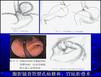 王秋生:外科治疗主要的目的是修复扩大的食管裂孔,另外还要加上抗反流手术。过去传统手术的创伤比较大(如图开胸和剖腹都会对人体产生较大的伤害),而现在伴随着腹腔镜胆囊切除这种微创外科的蓬勃发展,腹腔镜治疗食道裂孔疝已经发展成为仅次于腹腔镜胆囊镜切除术的第二个成熟、定型的手术。如图腹腔镜手术只需要在上腹部打4-5个1厘米左右的孔就可以解决问题了,如图进入切口后把食道分离,然后穿一个纱带或橡皮管,再把食道拉起,然后把扩大的食道裂孔缝合一部分,再把胃底的血管给游离断,因为还要做抗反流手术。如果仅仅只做修补不做抗反流手术,疗效会很差。如图再进行抗反流手术,首先把胃底从食道的后面掏过来,然后在食道和胃之间进行缝合。这种手术是一种很成熟的手术方法。手术后有的人由于手术过程中包绕的松紧程度掌握不好,会有打不了嗝的现象,甚至出现吞咽困难的情况,后来又发明了部分胃底折叠的方法,只包绕2/3的部分,这样术后打嗝的现象就解决了。这种部分折叠的手术方法是目前最为流行的,抗反流手术后整个治疗滑动性疝的过程就结束了。对于食管旁疝如图旁疝患者的胃壁变得非常薄,很容易造成撕裂,因此会加上一些垫片,这种垫片可以防止胃壁穿孔。这种手术的优点总结起来就是: