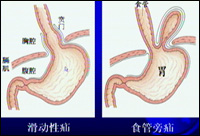 主持人:食道裂孔疝是一种什么样的疾病? 王秋生:疝是一种常见病,大家最常见的是小肠疝气,小肠疝气属于腹外疝,是可以看见的,除此之外还有一些看不见的疝,也就是腹内疝,食道裂孔疝就是一种典型的腹内疝。所谓疝就是指腹内的脏器或组织通过一些天然的裂隙或者通过后天造成的某种薄弱环节到达了不应该到的区域。如图食道裂孔是食道穿越隔肌时候的一个天然的裂孔,这个裂孔在正常情况下像一个围绕着食道周围的弹力绷带,具有抗反流的作用。 张正:发生食道裂孔疝的原因主要有两方面:1、解剖学发生了变化,也就是所谓弹力绷带发生薄弱的情况,或者是隔肌角的肌肉发生了变化。2、其它生理状况,比如腹内压增高时、妊娠时、肥胖,其中肥胖造成食道裂孔疝的原因是由于肥胖使腹腔里的内容物增多了,压力增大。还有一些辅助因素如抽烟、喝酒都可以引起食道裂孔疝。 王秋生:如图图中是最常见的两种食道裂孔疝即滑动性疝和食管旁疝。其中滑动性疝占整个食道裂孔疝数量的85%左右。食管旁疝发生率较低但是一般症状较重,一旦发现就需要及时治疗。