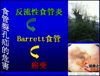 主持人:食道裂孔疝有哪些症状? 张正:两种食道裂孔疝即滑动性疝和食管旁疝的症状是不一样的。 滑动性疝 胸痛、烧心和反食、嗳气、打嗝、合并食管狭窄时吞咽不畅 甚至吞咽困难 食管旁疝 胃脘不适、吞咽不畅、餐后饱胀、胸内作响、压肺致咳、偶有憋状 王秋生:食道裂孔疝特别是滑动性疝引起的主要症状就是反流性食管炎,反流性食管炎往往是一种慢性疾病,大约有10%的反流性食管炎会发生Barrett食管,Barrett食管是一种癌前病变,再往下发展就会有8%--40%的病人会发生癌变。如图左图是正常结构,中上图是滑疝,右上图是旁疝,左下图是混合型疝,更严重的情况是当裂孔足够大时,连结肠、脾、小肠整个胃都可以翻转到胸腔中去,这种情况就需要紧急手术。