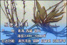 主持人:来看一段有关藏医藏药的片子:藏药材包括植物、动物、矿物类的药材大约有2000多种,青藏高原的特点就是高寒缺氧、日照时间长、紫外光线辐射强、昼夜温差大、没有污染等,这种独特的条件造成了藏药的有效成分高、药效非常强的特点,是其它药物无法比拟的,对于疑难杂症的治疗有它特殊的优势。
