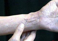主持人:那么三个穴位是如何去寻找的呢?来看一个小片子。 祝总骥:首先要找的是合谷穴,把左手举起,虎口撑开,右手大拇指竖直放在虎口上,大拇指所指的位置就是合谷穴。按摩时把右手转过来握紧左手进行按摩,左右揉一揉,按摩后应该有酸、麻、胀的感觉。找内关穴先把左手放平,手腕之间有一条纹叫做腕横纹,将右手的食指、中指、无名指放在腕横纹上面,食指所指的点,并且在两条筋的中间,就是内关穴。按摩时在这两条筋之间上下进行按摩就可以了,如果感觉不太好,还需要左右揉一揉,按摩后也应该有酸、麻、胀的感觉。找足三里首先要找到外膝眼(髌骨下面),比如左腿就应该是把左手的四趾(大拇指除外)放在外膝眼下,然后把右手的大拇指放在胫骨的外侧,这时右手大拇指和小指的交叉点就是足三里穴。按摩时右手要攥紧左腿,然后进行按摩(左右揉),按摩后酸胀的感觉可以一直窜到脚面上来。