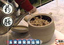 王钢:第二个方子叫做玉米须煮丝瓜络,这是一种比较简便实惠的方法。用料:玉米须30-50克、丝瓜络30-50克。玉米须有降压利尿的作用,丝瓜络有治疗关节疼痛的作用,这两个方子合在一起有改善肾功能的作用。把它们放入水中,用冷水浸泡半小时,然后煮20-30分钟,可以代茶饮,有水肿的病人可以达到消水肿的作用,即使没有水肿的病人也可以通过这种方法可以提高每日的尿量,可以从小便里面帮助毒素的排泄。这个方子在全国各地、春夏秋冬都可以找得到,比较简单实惠。 玉米须煮丝瓜络 ◆ 适宜慢性肾衰病人中尿酸高的、关节疼痛的、有水肿的患者