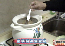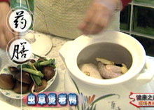 主持人:可以介绍几个易于操作的提高肾功能的药膳秘方吗? 邹燕勤:首先给大家介绍的是虫草煲老鸭汤(老鸭是指前一年的鸭子):用料:枸杞20克、虫草3克、老鸭一只,香菇、葱、姜适量。做法是首先把鸭子里面的内脏都去掉,洗净后放入虫草,然后把剖开的口缝起来,再放入其它配料,接着放一些料酒,再放入水把鸭子浸没。烧的时候首先用大火烧开,然后用文火煲一小时左右,起锅以前放适量盐。吃的时候以喝汤为主,喝完汤后还可以加水继续煮。 虫草煲老鸭 ◆ 适宜早中期慢性肾衰体质虚弱的患者 ◆ 饮用时应该少吃鸭子、多喝汤以控制蛋白质的摄入量