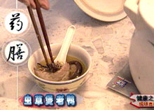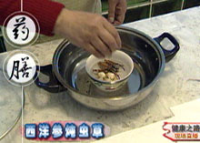 主持人:对于中晚期患者有哪些秘方? 邹燕勤:虫草炖西洋参:虫草3克、西洋参3克,然后放在碗里面隔水蒸三十分钟左右,可以反复炖(一天三次)。这种方法的疗效是非常好的。 西洋参炖虫草 ◆ 适宜各期慢性肾衰病人,有恢复体力改善肾功能的作用。 ◆ 注意:高血压患者西洋参比例要减少。