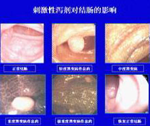 主持人:吃泻药的方法可取吗? 傅传刚:有很多泻药对于便秘是很有效果的,但是缺点和危害都很大,尤其有一大类刺激性泻药的作用机理就是对肠道进行强力的刺激,使用这种药物有很大的依赖性,到了后期不仅肠壁会出现问题,肠道也会变成管状的,在切片下面可以看到神经纤维完全都是萎缩的。如图正常的肠壁是非常柔软和光滑的,其它不正常的情况是多种多样的,颜色都非常黑。所以刺激性的泻剂是一定不能长期吃的。 常用通便药物分类 1、 容积性泻剂:麦麸、纤维素 2、 润滑性泻剂:石蜡油、甘油、蜂蜜、麻油 3、 渗透性:福松、乳果糖 4、 盐类泻剂:硫酸镁、硫酸盐 5、 刺激性泻剂:大黄、果导、番泻叶、蓖麻油、芦荟 我们鼓励大家多吃纤维素食物、增加体积、多喝水,导致一个正常的排便,但是对于有些对泻药已经产生了一定依赖性的患者,可以逐渐减少剂量,延长周期,停药1-2年后肠壁马上就可以恢复正常。另外我们主张便秘患者要多吃渗透性的泻剂,对肠壁是没有损害的。另外也不是说刺激性的泻药一定都不能吃,对于长期大便干结的老人来说,临时、间断性地使用是可以的。