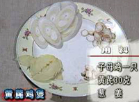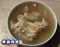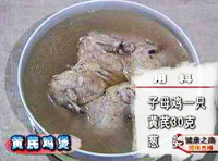 主持人:再来看一道药膳:黄芪鸡煲:用料:子母鸡一只、黄芪30克、葱姜,先大火烧开再小火炖,起锅前加一点盐或者根据自己的口味加一些调料就可以了。 李跃华:黄芪在中药中具有健脾益气的作用,加入鸡一起炖就可以使体虚的人身体得以进补,增强免疫功能。应该注意的是中药的补药通常是时间越长药效发挥越好。选用砂锅、气锅效果会更好,不要用铁锅或者铝锅。