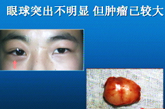 主持人:如果表面看来并不明显,长的肿瘤会很大吗? 肖利华:再来看一张图,眼球突出并不明显,但肿瘤已较大。