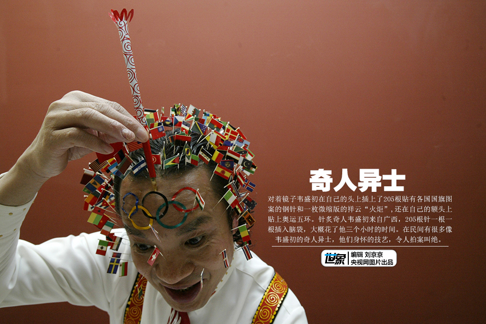 对着镜子韦盛初在自己的头上插上了205根贴有各国国旗图案的钢针和一枚微缩版的祥云“火炬”,还在自己的额头上贴上奥运五环。针炙奇人韦盛初来自广西,205根针一根一根插入脑袋,大概花了他三个小时的时间。在民间有很多像韦盛初的奇人异士,他们身怀的技艺,令人拍案叫绝。