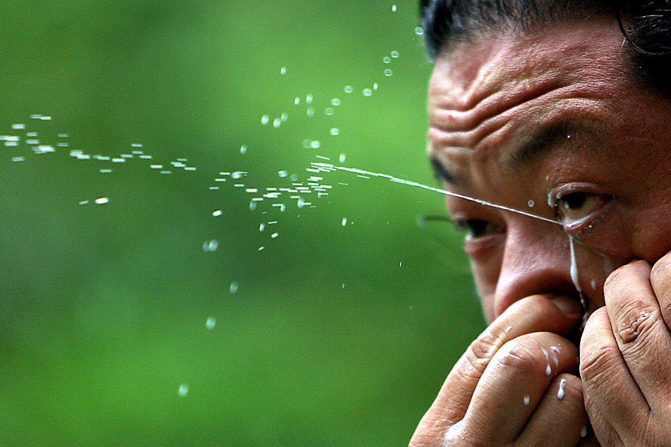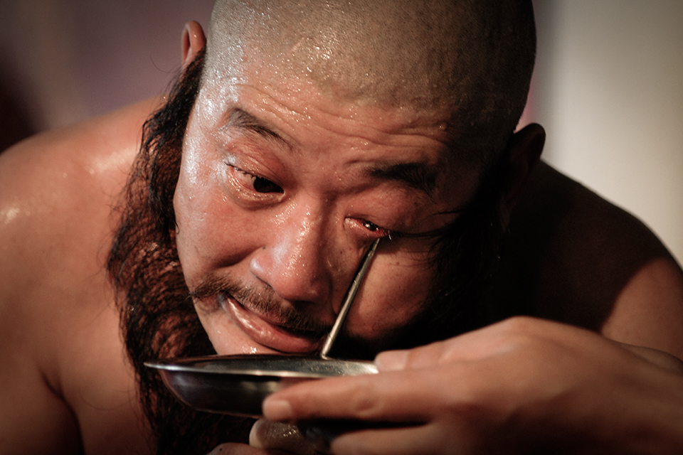 2006年6月29日,南京,来自山东的奇人张映敏用鼻子吸入一些牛奶,然后一使劲,这些牛奶竟然又从眼睛里喷射而出,在空中形成几道优美的白色弧线,落在近两米外的地面上。 CFP