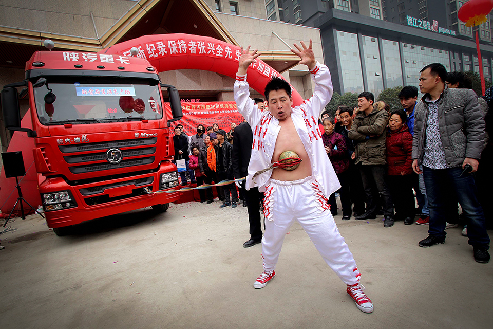 2014年3月2日,西安,张兴全表演肚皮吸碗拉汽车。他将一个约4斤重的铁碗牢牢地吸附在肚皮上,并在碗柄上系了一根粗绳子,绳子的另一头是一辆自重10吨的大卡车。随着张兴全发力,大卡车开始移动。1米、2米……一共拖行了10米距离。 梁萌/CFP