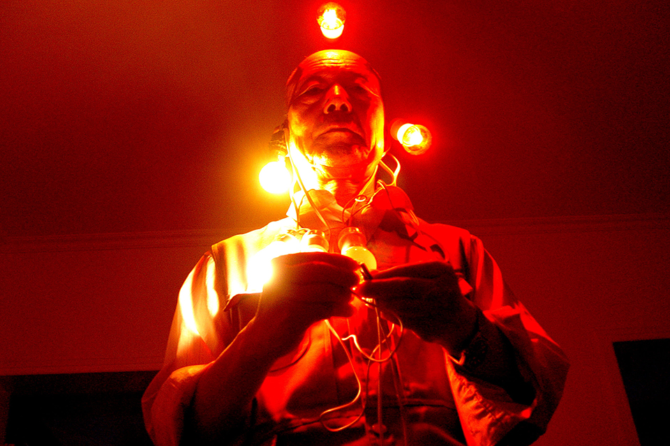 2007年7月6日,新疆阿勒泰,张德科老人在头上耳朵上挂了6只13瓦的红、白色小灯泡,一手抓住电线的火线,另一手抓住电线的零线,接通电源后,220伏电流从他身上流过,6只13瓦灯泡全亮了起来,并且灯泡的亮暗程度他还可以控制。 张秀科/CFP
