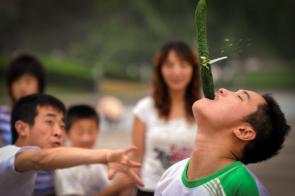 2010年7月2日,济南泉城广场,青岛小伙白登春展示他的独门绝技--扑克牌切黄瓜。白登春使用普通扑克牌,站在离黄瓜2米多远的地方,直接将扑克飞向黄瓜,牌过之处,黄瓜尽断。 王锋/CFP