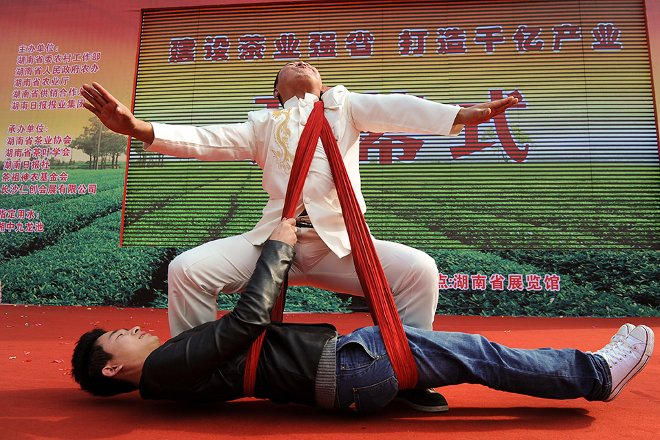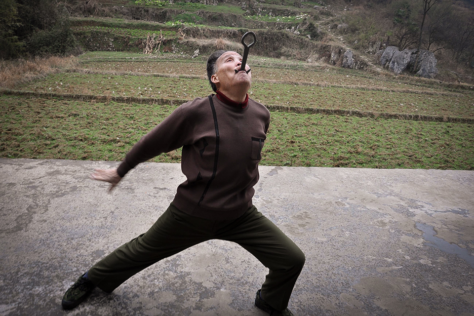2012年3月17日,湖南省娄底市新化县圳上镇,武术家方吉发将40多厘米长的钢刀全部吞入口中。 CFP