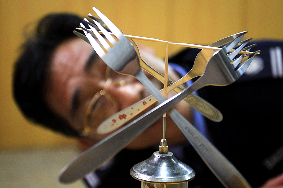 2014年3月19日,湖南长沙,平衡达人崔聚国展示绝技,3根牙签一个交叉点能托起4支叉子。 周强/CFP