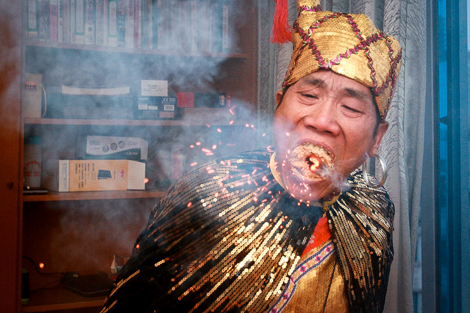2013年2月28日,四川绵阳,刘飞表演“口吞锯末”吐火。刘飞先是将锯末慢慢塞满嘴,然后开始运气,并不时拍手,1分钟后,口中开始冒烟,随后他拿出扇子,不停地扇左耳朵,口中开始冒出浓烟,2分钟后,口中有火星冒出。然后他又抓起一把锯末,将嘴填满,随后口中便开始吐出明火,持续了1分多钟,最后他将口中燃尽的锯末吐出。整个锯末吐火绝技持续了近5分钟,场面十分壮观。 CFP