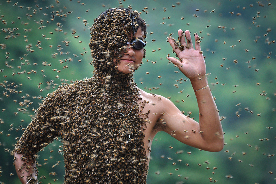 2011年7月16日,在湖南邵阳市隆回县虎形山上,农民吕孔江穿着平角短裤,赤身站在电子秤上,20余万只,重22公斤的蜜蜂爬满他的身体。 吕建设/CFP
