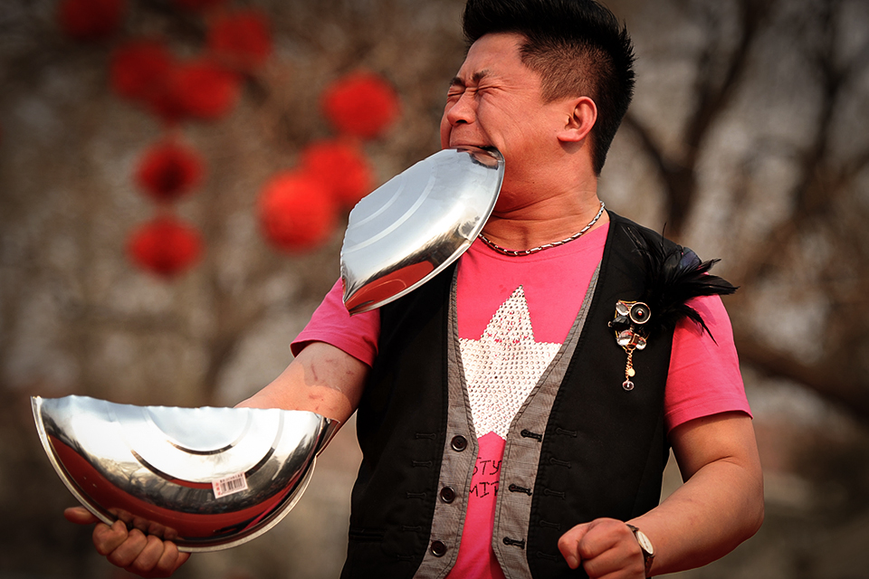2011年2月5日,在北京龙潭庙会现场,民间艺人陈伟表演用牙齿咬断不锈钢锅盖。 李文明/CFP
