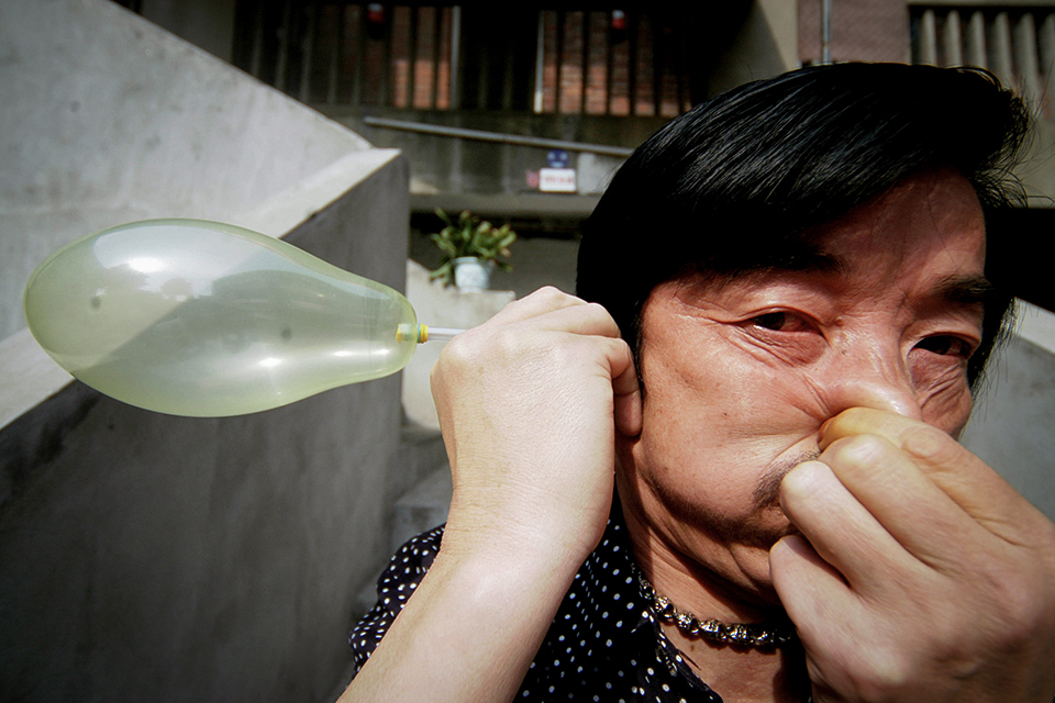 2006年5月11日,南京,湖北奇人洪国斌展示他的拿手绝活,耳朵吹气球。 邵丹/CFP