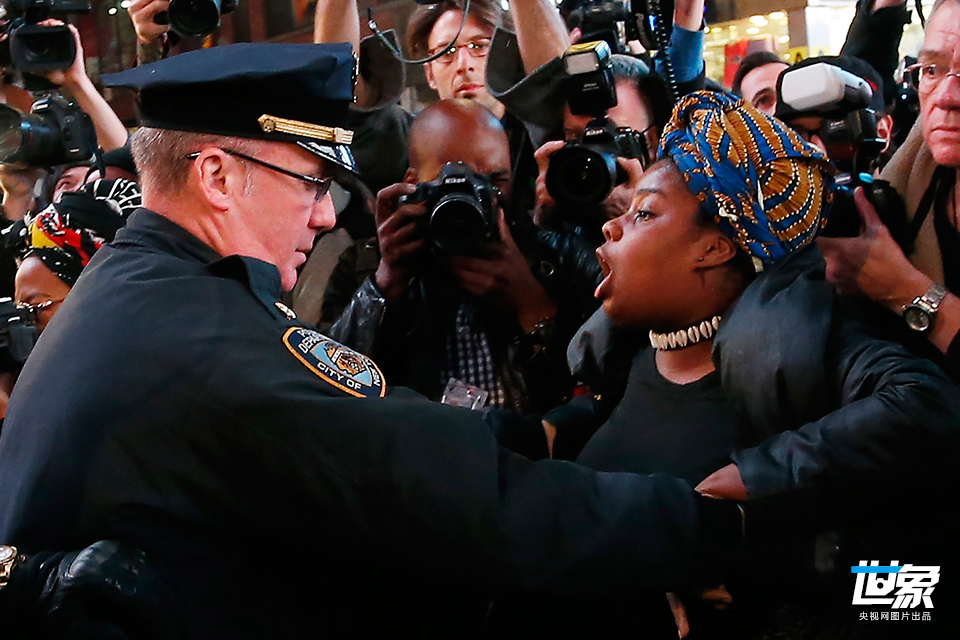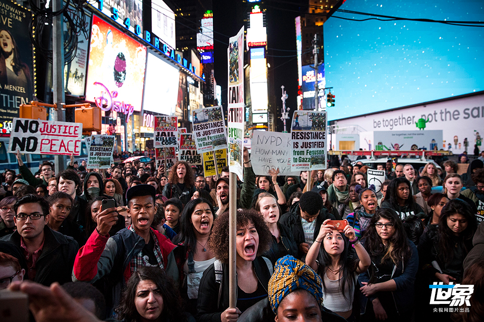 当地时间2014年11月25日,美国纽约,示威者们聚集纽约时代广场,持续抗议圣路易斯大陪审团决定不起诉枪杀黑人青年迈克尔·布朗的白人警察达伦·威尔逊。 Andrew Burton/GettyNorthAmerica/CFP