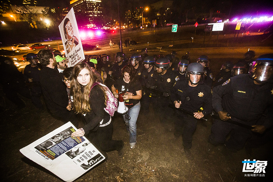 当地时间2014年11月26日,美国洛杉矶,警察驱逐高速路上的示威者。 RINGO CHIU/CFP