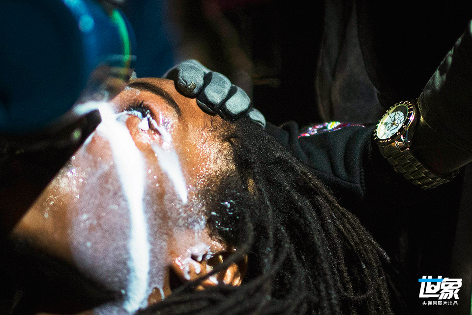当地时间2014年11月26日,美国弗格森,示威民众与警察冲突。图为一名示威者清洗面部的胡椒喷雾。 CFP