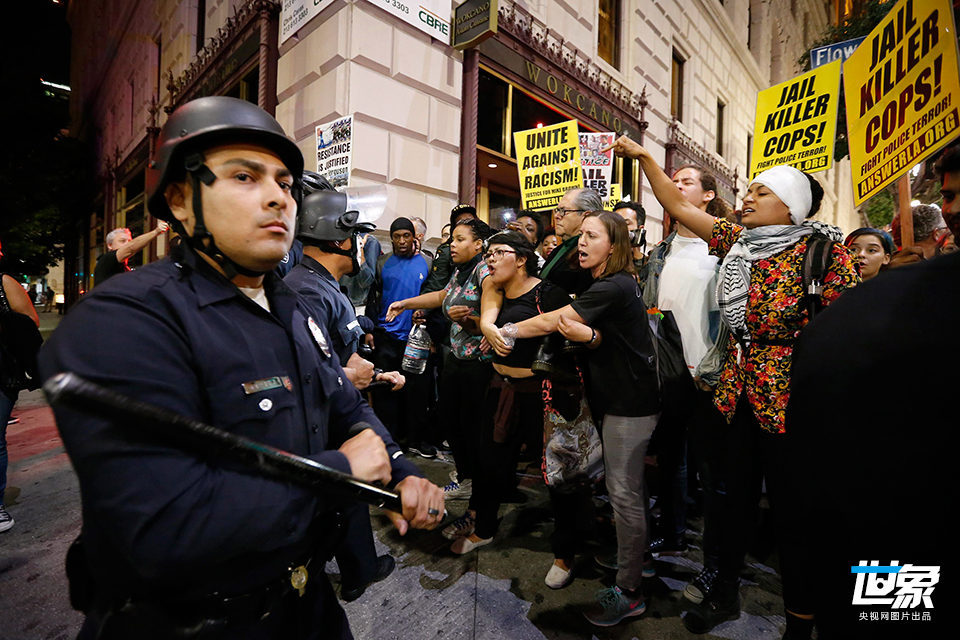 当地时间2014年11月26日,美国洛杉矶,警方试图稳住示威者。CFP
