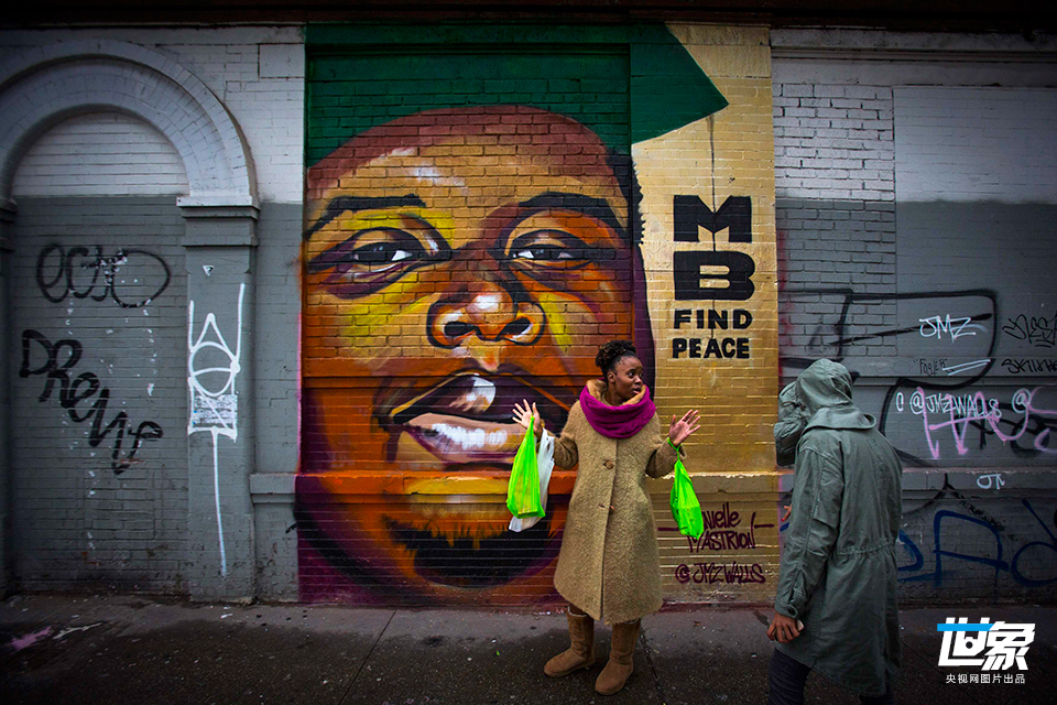 当地时间2014年11月27日,美国纽约,布鲁克林街头的一幅壁画,描绘了弗格森案中被警察枪杀的黑人青年布朗。 CFP
