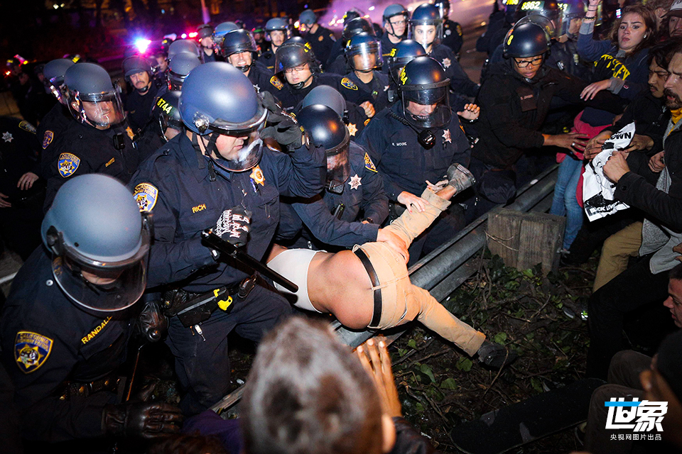 当地时间2014年11月24日,美国加利福尼亚州奥克兰,警方在示威人群中逮捕抗议者。 CFP